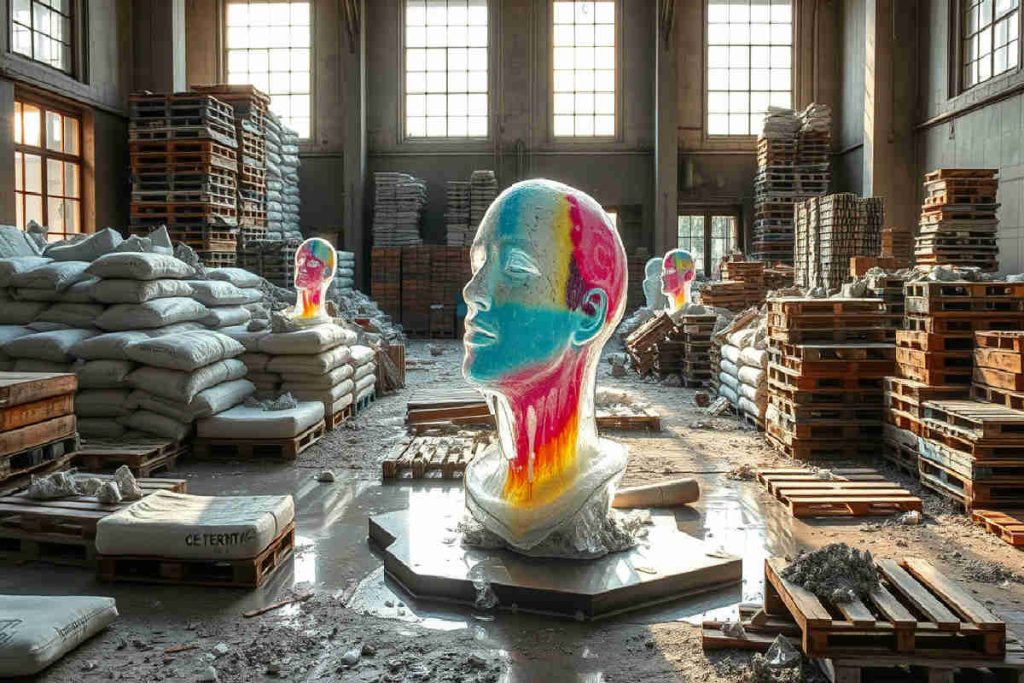 Il processo è calibrato nei minimi dettagli: l’acqua che serve per far indurire il cemento è quasi la stessa che si libera dal ghiaccio che si scioglie. Così nasce una cavità interna, un vuoto plastico che riproduce il profilo della testa. Questo metodo trasforma un semplice incrocio di materiali da costruzione e ghiaccio in uno spazio dove tecnica e memoria si fondono, e la scultura nasce dall’incontro tra ciò che è effimero e ciò che resta.